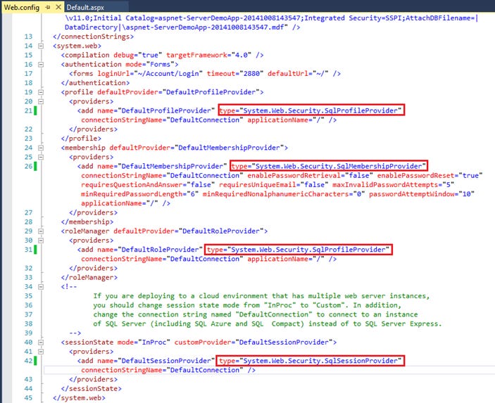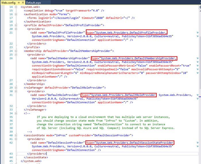 Sau đó mở file web.config. Hiện thời với project template trên đã sử dụng Universal Provider ta cần thay lại bằng Membership Provider