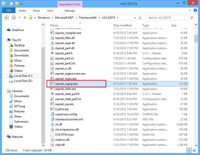Sau đó chạy tool aspnet_regsql.exe từ thư mục C:\Windows\Microsoft.NET\Framework64\v4.0.30319 như bên dưới