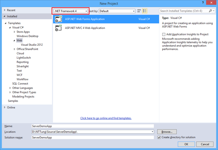 Đầu tiên tạo project ServerDemoApp, chú ý lựa chọn Framework 4.0