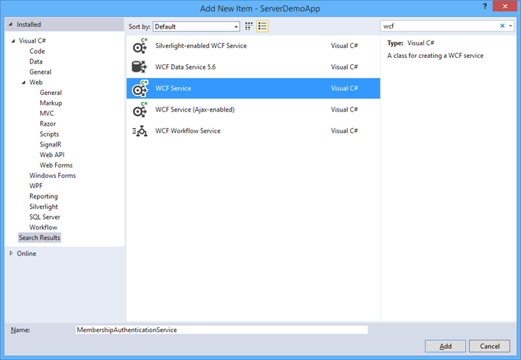 Sau khi đã khởi tạo thành công membership provider, bước cuối cùng là tạo authentication service giúp cho các ứng dụng desktop, mobile có thể sử dụng để authenticate và authorize (authentication mobile app). Đầu tiên cần tạo một wcf service