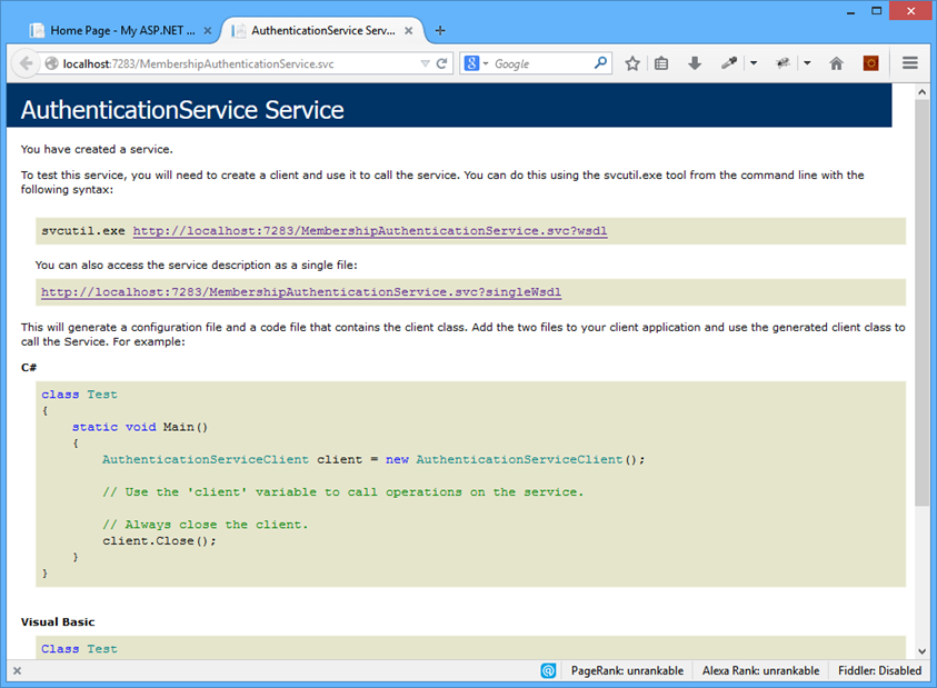 </system.web.extensions>Service Authentication đã được cấu hình thành công và các ứng dụng desktop/mobile có thể sử dụng ngay service này để login/logout/validate người dùng. Ta thử browser service sẽ thấy như sau: