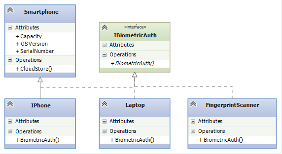 Áp vào VD trên, ta có thể tạo ra một interface là IBiometricAuth với một phương thức là BiometricAuth(). Tiếp theo cho các lớp Iphone, Laptop, FingerprintScanner thực thi interface IBiometricAuth này như hình sau