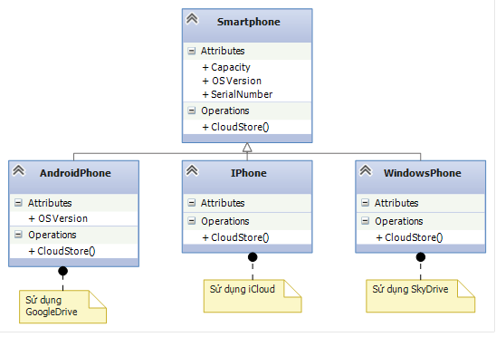 Ví dụ như ở phần trên, mỗi một smartphone kế thừa từ lớp Smartphone nhưng có thể lưu trữ dữ liệu trên cloud theo những cách khác nhau: