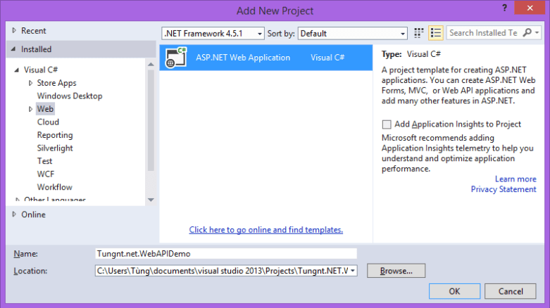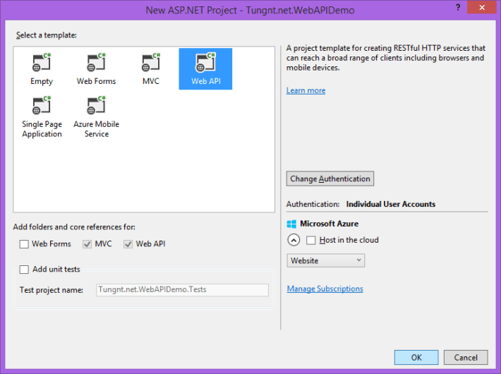 Trong Visual Studio 2013 ta tạo thêm một project ASP.NET Web Application và chọn template Web API như hình dưới