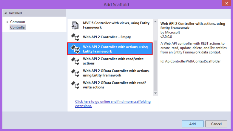 Right click vào thư mục Controllers và chọn thêm controller. Ở bước này bạn có thể chọn Web API 2 Controller Empty để tự viết các phương thức từ đầu hoặc bạn cũng có thể chọn Web API 2 Controller with read/write actions khi đó Visual Studio sẽ hỗ trợ sinh ra các phương thức ví dụ để bạn có thể biết cách viết các service này. Ở đây tôi chọn Web API 2 Controller with actions, using Entity Framework vì tôi muốn Visual Studio sinh sẵn các code cho tôi theo Model luôn như hình sau: