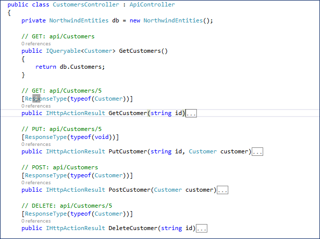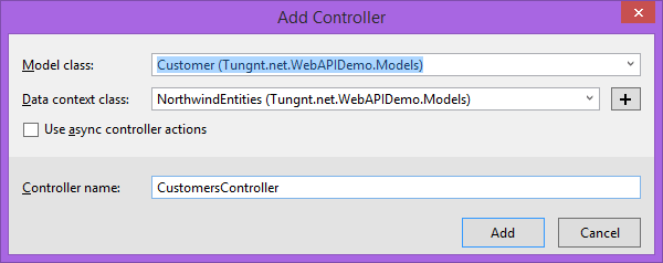 Tại cửa sổ Add Controller chọn Model class chính là Customer vừa tạo ở bước trên và click Add ta sẽ thấy Visual Studio sinh ra các phương thức Get/Post/Put/Delete với tất cả các code xử lý dùng LINQ theo đúng Model Customer đã chọn