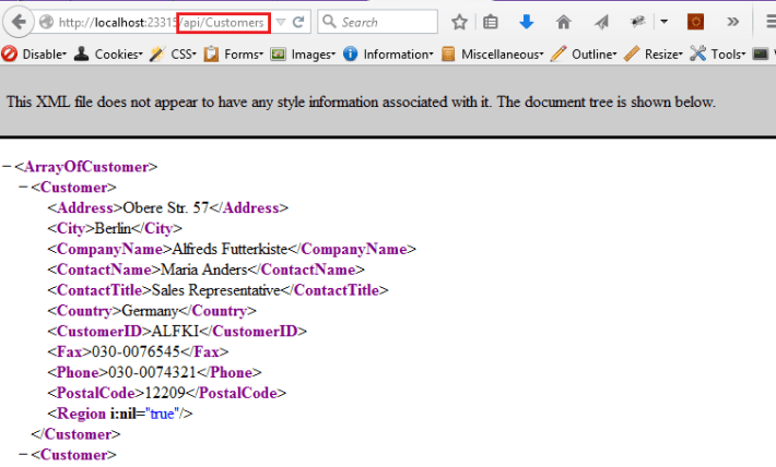 Trên browser chúng ta chỉ có thể kiểm tra nhanh được các service dạng Get nên ta sẽ kiểm tra service GetCustomers bằng cách sử dụng url thêm api/Customers như sau