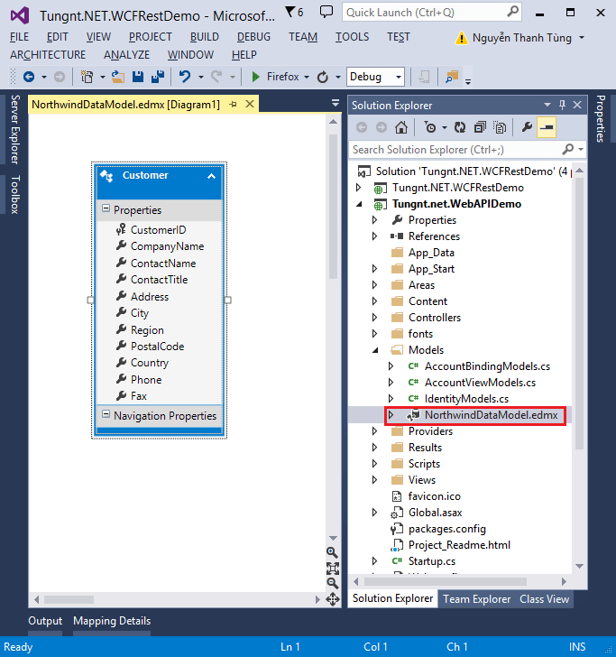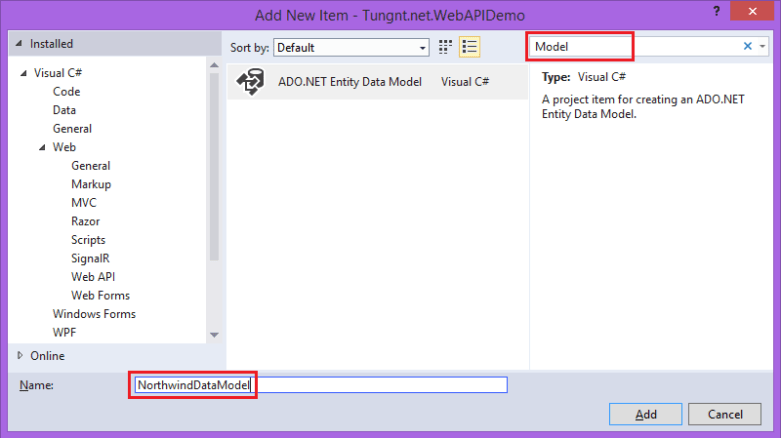Trong project Tungnt.net.WebAPIDemo, right-click vào Models và chọn thêm New Item. Tìm từ khóa Model và chọn ADO.NET Entity Data Model đặt tên NorthwindDataModel như hình dưới:
