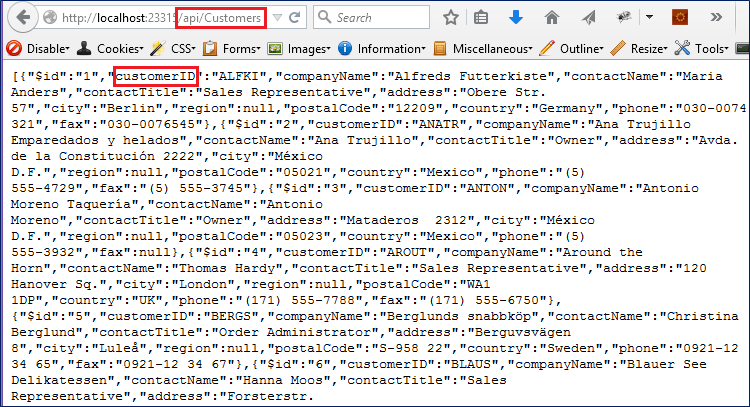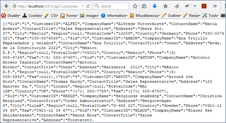 Câu trả lời rất đơn giản vì Web API đã hỗ trợ sẵn chúng ta chỉ cần config mà thôi. Mở file WebApiConfig.cs trong thư mục App_Start và thêm dòng sau vào trong phương thức Register và thử kiểm tra lại api GetCustomers trên browser ta sẽ thấy service giờ chỉ trả về JSON