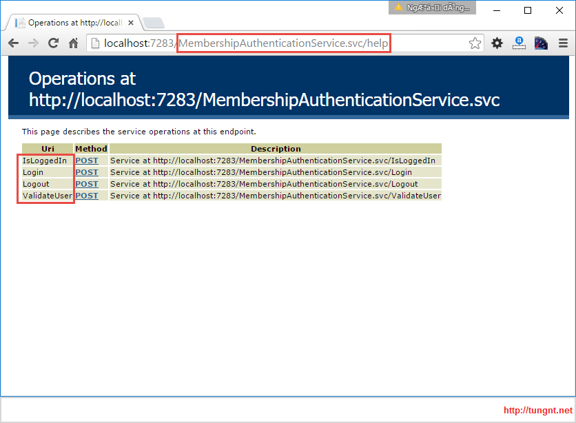 <serviceHostingEnvironment multipleSiteBindingsEnabled="true" aspNetCompatibilityEnabled="true" />Sau đó kiểm tra authentication service xem đã expose JSON hay chưa bằng cách browser service help