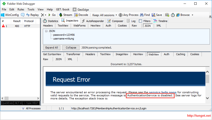 Dùng fiddler thử gọi service authentication login với một account cụ thể chúng ta sẽ thấy lỗi AuthenticationService is disabled như bên dưới