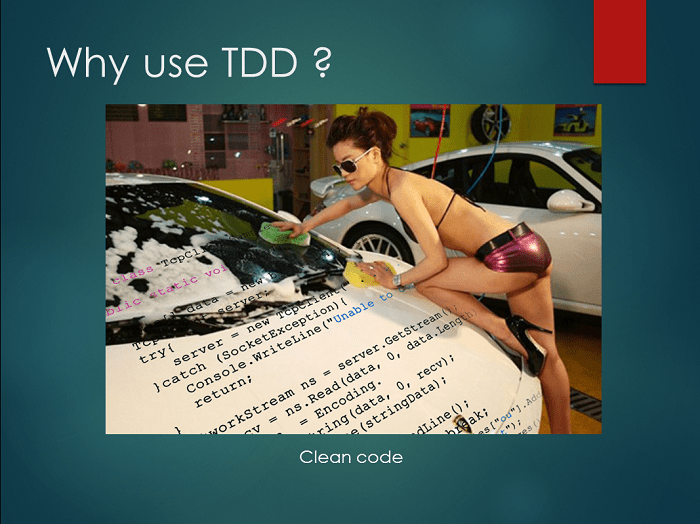 Bài trình bày của Lê Anh rất ngắn gọn và xúc tích nêu bật được những điểm nhấn như lý do tại sao lại nên sử dụng TDD: Clean code, prevent bugs, maintainable, flexible, extensible…