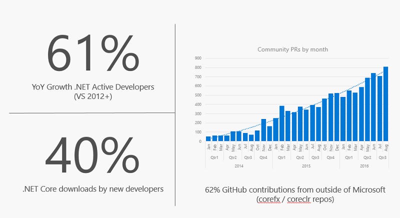 Cùng với rất nhiều công bố mới về công nghệ Mobile, Cloud, Microsoft cũng không quên nhắc đến .NET, nền tảng phát triển chính trên Windows. Microsoft cũng ra mắt phiên bản .NET Core 1.1 bổ sung hơn 1300 API và tích hợp chặt chẽ với Azure. Một thông tin hết sức thú vị được chia sẻ đó là hơn 60% số code mới của .NET Core được đóng góp từ cộng đồng open source chứ không phải từ chính Microsoft.