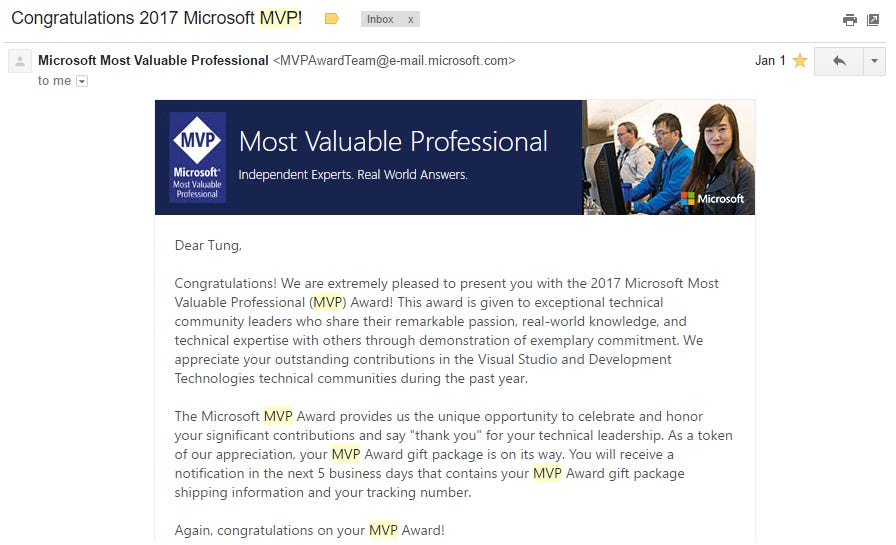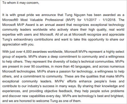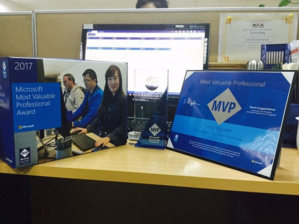 Phải nói là rất vui khi đầu năm nay mình nhận được thư chúc mừng từ Microsoft thông báo mình đã nhận được giải thưởng Most Valuable Professional (MVP) 2017, tạm dịch là "Chuyên gia có giá trị nhất" của Microsoft.