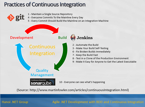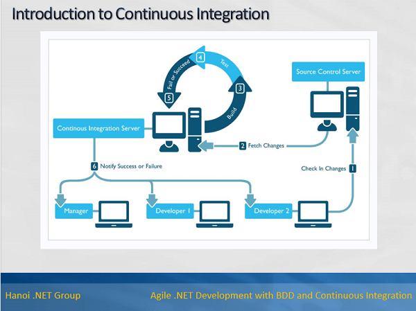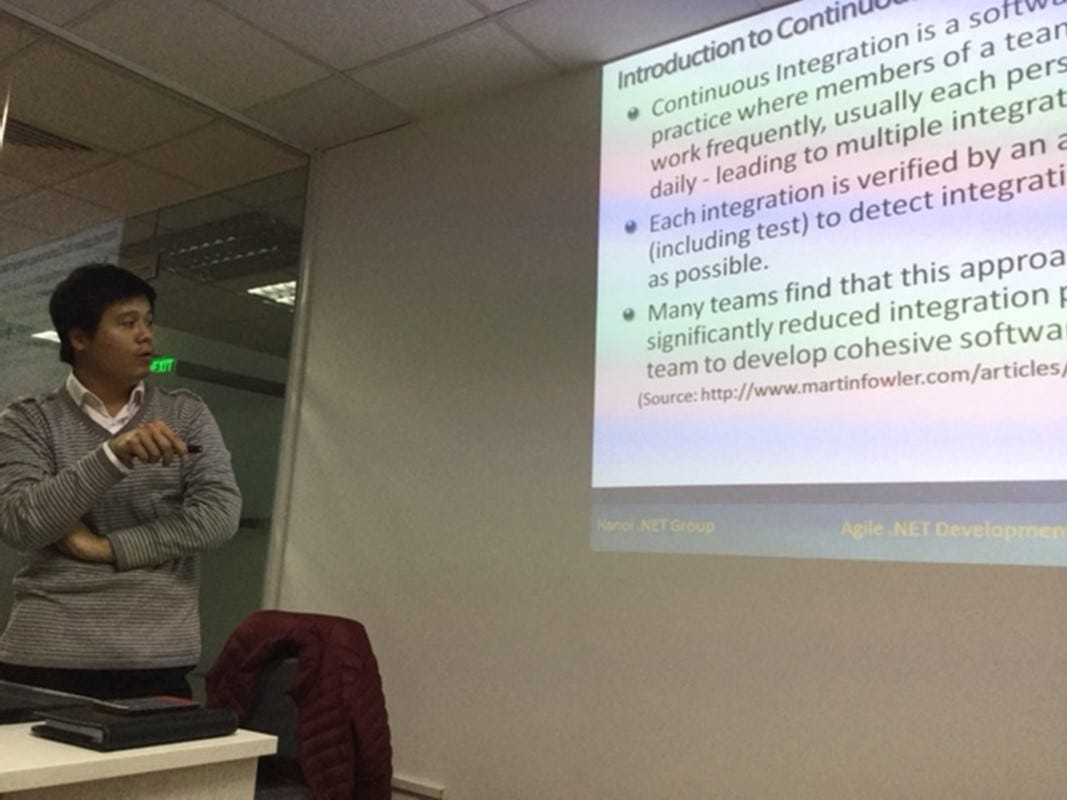 Tiếp theo diễn giả giới thiệu về Continuous Integration – software practice trong việc tích hợp liên tục source code.