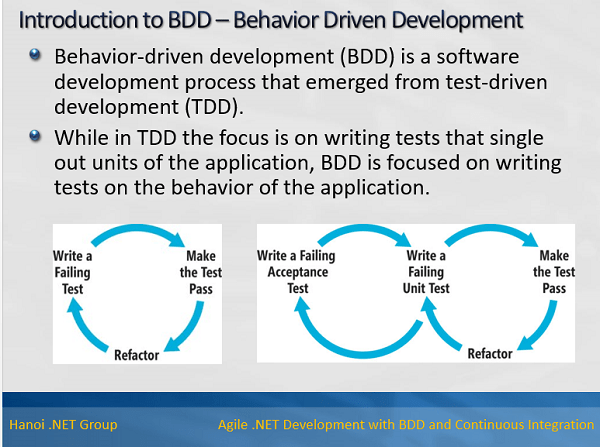 BDD là một bước tiến hóa của TDD, nó tập trung vào viết user acception test hơn là unit test như trong TDD.