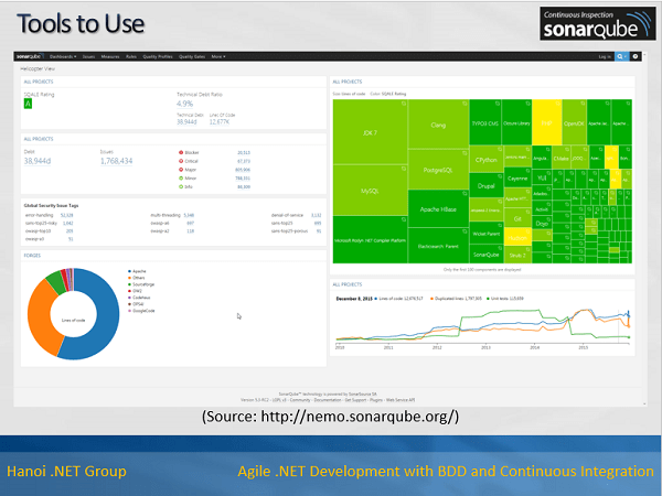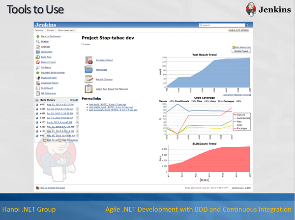 Cuối cùng diễn giả demo sử dụng các công cụ để thực hiện CI bao gồm: SpecFlow kết hợp Visual Studio viết user acceptance test, Jenkin CI – Continuous integration tool, SonarQube – tool phân tích và đo chất lượng code