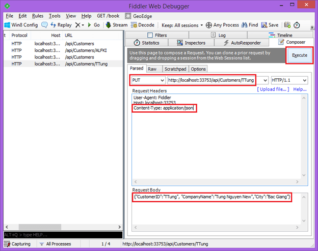 Chúng ta đã thêm xong dữ liệu bằng POST lên Fiddler các bước để cập nhật dữ liệu bằng PUT service cũng được thực hiện tương tự như sau: