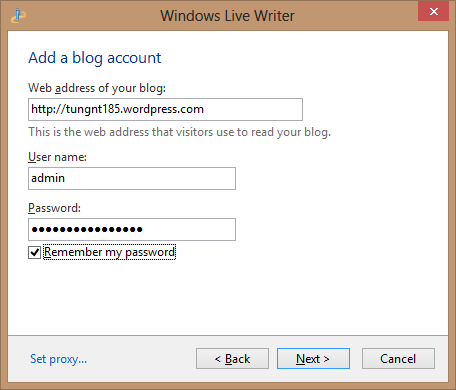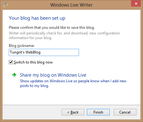 Thiết lập hoàn thành và bạn chỉ cần chọn một blog nickname để sử dụng trong Live Writer