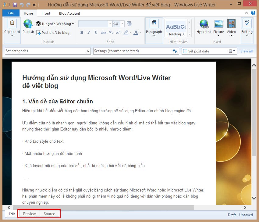 Ưu điểm hơn của Live Writer so với Word đó là Live Writer có chế độ Preview cho phép bạn xem được ngay nội dung bài Post trên như trên Web (khoảng 90% tùy theme) và xem được cả mã HTML của bài Post qua tab Source như hình trên.