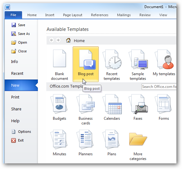 Mở Word sau đó click File tab-> New -> Blog post như hình dưới