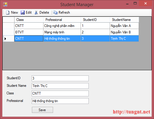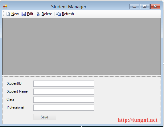 Bước 4: Viết Code xử lý cho các sự kiện trên Toolbar và button Save. (Chú ý: double click vào từng toolItem và button Save trên designer để Visual Studio sinh cho ta các event handler tương ứng) Ở đây trong bài này để phục vụ mục đích demo nên chúng ta không sử dụng các cơ chế binding tự động qua BindingSource cũng như DataSet trên DataGridView mà sẽ viết hoàn toàn trong code.