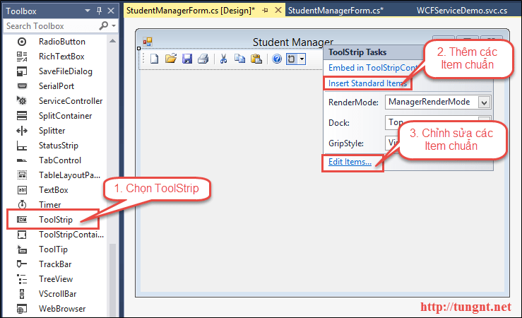Thêm ToolStrip có 4 chức năng Thêm, Sửa, Xóa, Nạp theo các bước: Thêm Toolstrip từ Toolbar, Thêm các Item chuẩn, Chỉnh sửa các Item Chuẩn