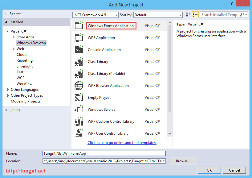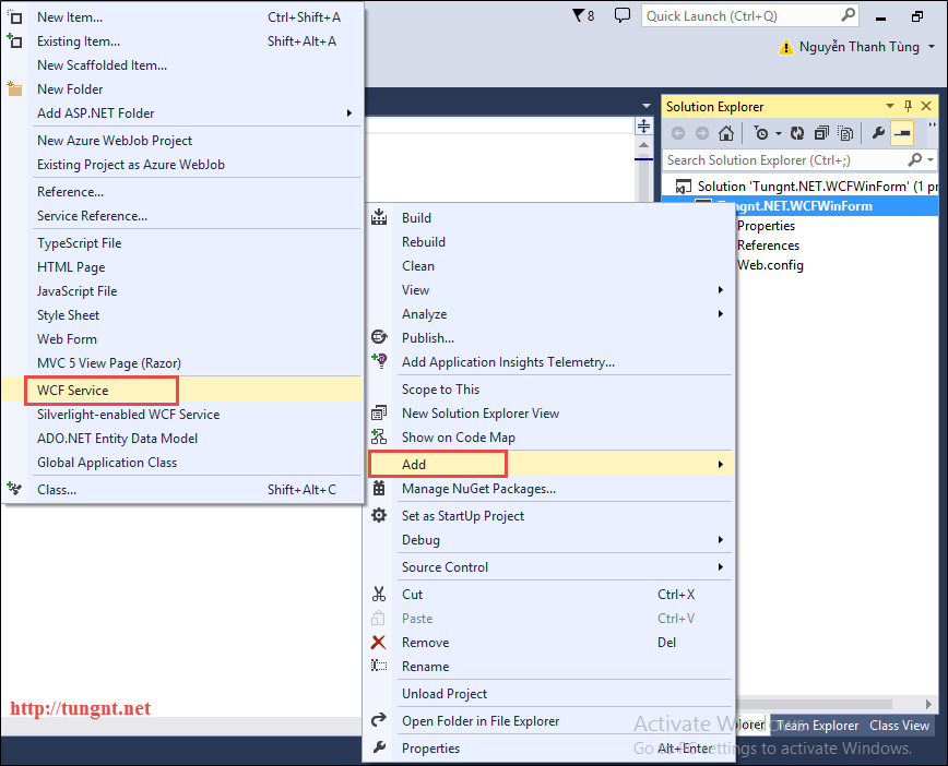 Bước 1: Trong solution Tungnt.NET.WCFWinForm ta tạo một Project Windows Form App như hình dưới