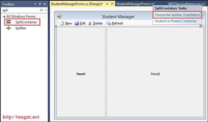 Thêm SplitContainer, chuyển mode về Horizontal Splitter Orientation.