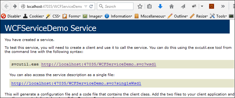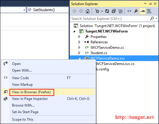 /// <summary> /// Student Manager Demo Using WCF in Winform Application /// @Created by tungnt.net - 5/2015 /// </summary> public class WCFServiceDemo : IWCFServiceDemo { //For demo purpose so we use a static list instead of database private static List<Student> studentList = new List<Student>() { new Student { StudentID = 1, StudentName = "Nguyễn Văn A", Class = "CNTT", Professional = "Công nghệ phần mềm" }, new Student { StudentID = 2, StudentName = "Nguyễn Văn B", Class = "ĐTVT", Professional = "Mạng máy tinh" } }; public List<Student> GetStudents() { return studentList; } public bool AddStudent(Student newStudent) { bool Result = false; try { studentList.Add(newStudent); Result = true; } catch (Exception) { Result = false; } return Result; } public bool UpdateStudent(Student updateStudent) { bool Result = false; try { var originalStudent = studentList.Where(e => e.StudentID == updateStudent.StudentID).FirstOrDefault(); if (originalStudent != null) { studentList.Remove(originalStudent); studentList.Add(updateStudent); Result = true; } } catch (Exception) { Result = false; } return Result; } public bool DeleteStudent(int studentID) { bool Result = false; try { var deleteStudent = studentList.Where(e => e.StudentID == studentID).FirstOrDefault(); if (deleteStudent != null) { studentList.Remove(deleteStudent); Result = true; } } catch (Exception) { Result = false; } return Result; } }Bước 5: Service đã xây dựng xong, bước cuối cùng là kiểm tra bằng browser xem mọi thứ đã ổn chưa