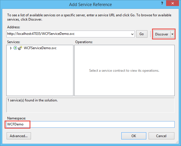 Bước 3: Right-click vào References và chọn Add Service Reference. Sau đó ta nhấn Discover để tìm các service trong cùng Solution. Ta sẽ thấy WCFServiceDemo service xuất hiện, ta tiến hành đặt tên Namespace service là WCFDemo và nhấn OK