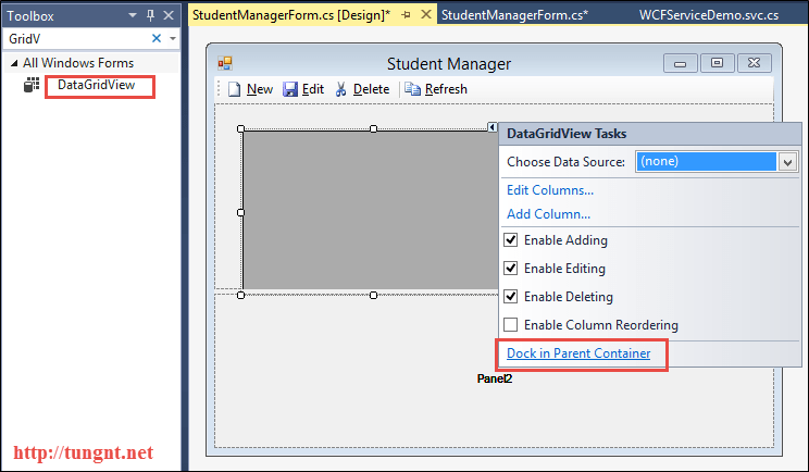 Sau đó kéo DataGridView vào Panel1, chọn Dock in Parent Container, đặt tên là gridStudent, chọn selectionMode = FullRowSelect để lựa chọn cả một row trên Grid chứ không phải từng cell