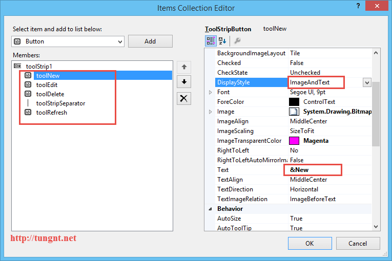 Khi chỉnh sửa các Item chuẩn một số thuộc tính cần chú ý đặt lại như: tên toolitem, Text của toolItem và đặc biệt là DisplayStyle: ImageAndText để hiển thị cả Image và Text như hình dưới