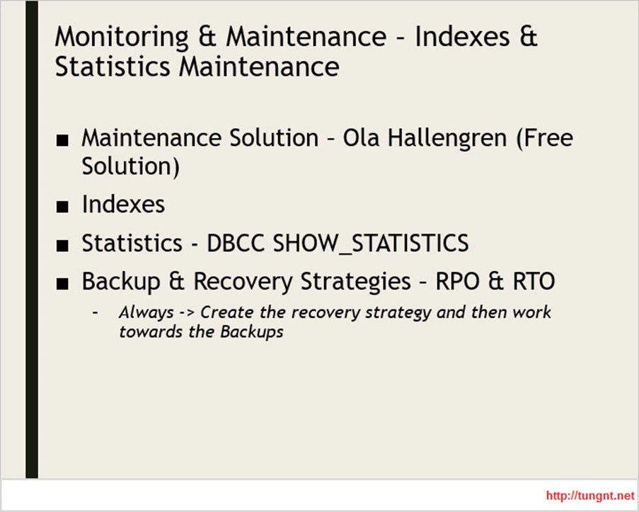 ưu hóa trong việc quản trị SQL database: Phần này Raluca nhấn mạnh vào vấn đề Monitoring & Maintenance plan, Backup & Recovery Strategies, đồng thời có chỉ ra bộ script maintenance cô hay dùng của tác giả Ola Hallengren vô cùng hữu ích, các bạn có thể download bộ script này ở đây.
